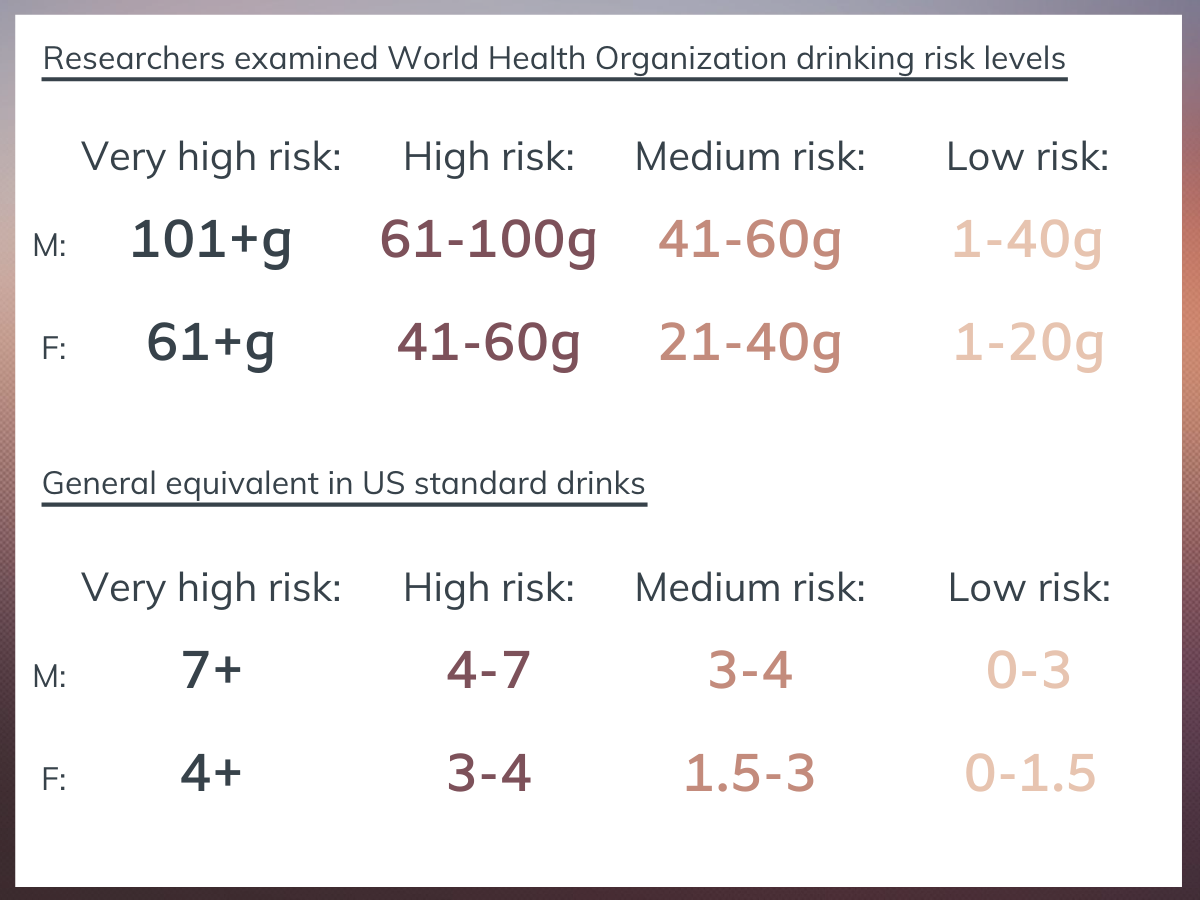 The authors calculated WHO risk levels for all study participants based on average amount of alcohol consumed per day over a period of one month. Risk levels were assessed at one month prior to receiving treatment (i.e., baseline), 1 month prior to the end of treatment (i.e., month 4 in COMBINE and month 3 in UKATT), and 1 year following the end of treatment (COMBINE) or treatment entry (UKATT). Alcohol dependence severity was assessed in the COMBINE study via the 4th edition of the Diagnostic and Statistical Manual of Mental Disorders (DSM-4) and in the UKATT study via the Alcohol Dependence Scale and the Leeds Dependence Questionnaire. Both studies also collected data related to other measures of health and well-being (i.e., liver enzymes, mental health, alcohol-related consequences).