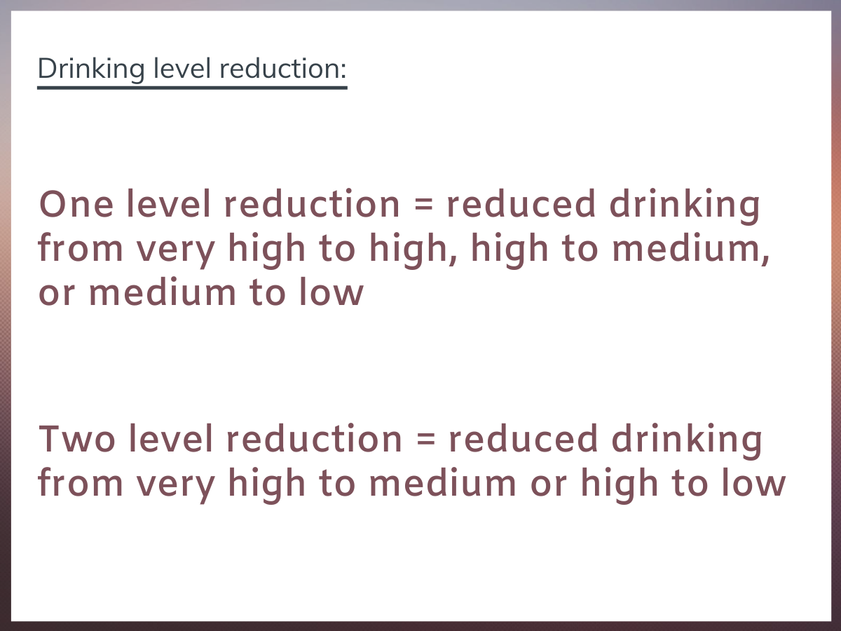 In both treatment samples, WHO risk level reductions of at least 1- and 2-levels were associated with significantly lower liver enzyme levels, improvements in mental health, and reductions in alcohol-related consequences. Moreover, the greater improvements in these measures of functioning were detected among those with the higher alcohol dependence severity.