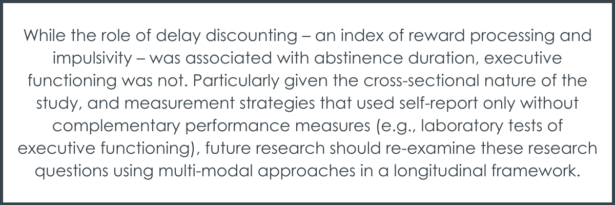 While the role of delay discounting – an index of reward processing and impulsivity – was associated with abstinence duration, executive functioning was not. Particularly given the cross-sectional nature of the study, and measurement strategies that used self-report only without complementary performance measures (e.g., laboratory tests of executive functioning), future research should re-examine these research questions using multi-modal approaches in a longitudinal framework.