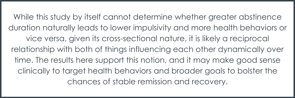 This study adds to existing work emphasizing the importance of healthy behaviors in successful substance use recovery, such as healthy eating, exercise, and adherence to a sleep routine. Consistent with broader conceptualizations, this work also highlights substance use recovery as often including significant growth and self-change, in addition to substance use abstinence. While this study by itself cannot determine whether greater abstinence duration naturally leads to lower impulsivity and more health behaviors or vice versa, given its cross-sectional nature, it is likely a reciprocal relationship with both of things influencing each other dynamically over time. The results here support this notion, and it may make good sense clinically to target health behaviors and broader goals to bolster the chances of stable remission and recovery. This study also suggested that individual differences in impulsivity may influence recovery success, thus treatments that help patients decrease impulsivity may have greater success. Despite the clear limitations of the current cross-sectional study design to consider, as more evidence is accumulated, scientists and clinicians can better take advantage of insights from studies like this to help develop and optimize such interventions.