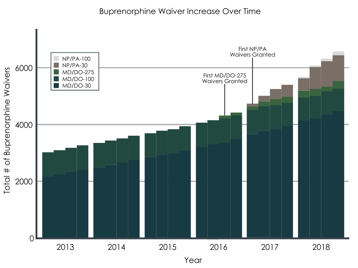 This study measured the impact of 2 federal policy changes that occurred around the same time in 2016 that broadly increased permissions with regard to who could prescribe buprenorphine and how many patients prescribers were permitted to serve at any one time. The first policy change, a final rule from the Substance Abuse and Mental Health Administration, increased the patient limit of physicians already waivered to prescribe buprenorphine from a maximum of 100 to a maximum of 275. The second policy change, part of a Congressional law called the Comprehensive Addiction and Recovery Act, allowed nurse practitioners and physician assistants to become waivered and prescribe buprenorphine for patients with opioid use disorder with a 30-patient limit.