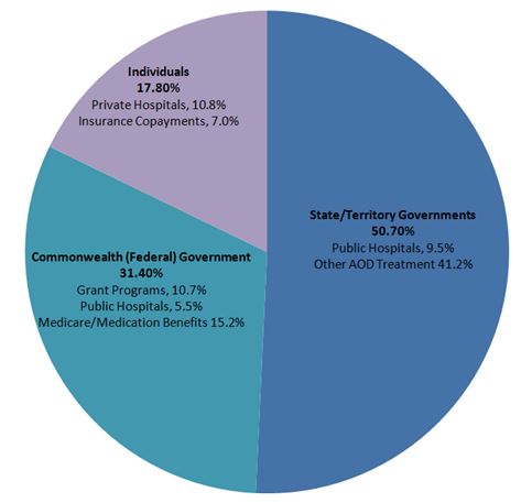 Finally, individuals also contribute to the treatment programs by paying private health insurance. Each of these national and state government programs, in addition to individual contributions, fund an array of AOD treatment services, including government and public hospital services, non-government programs, community health programs, medical and psychological support services, and pharmacy and private hospital services.